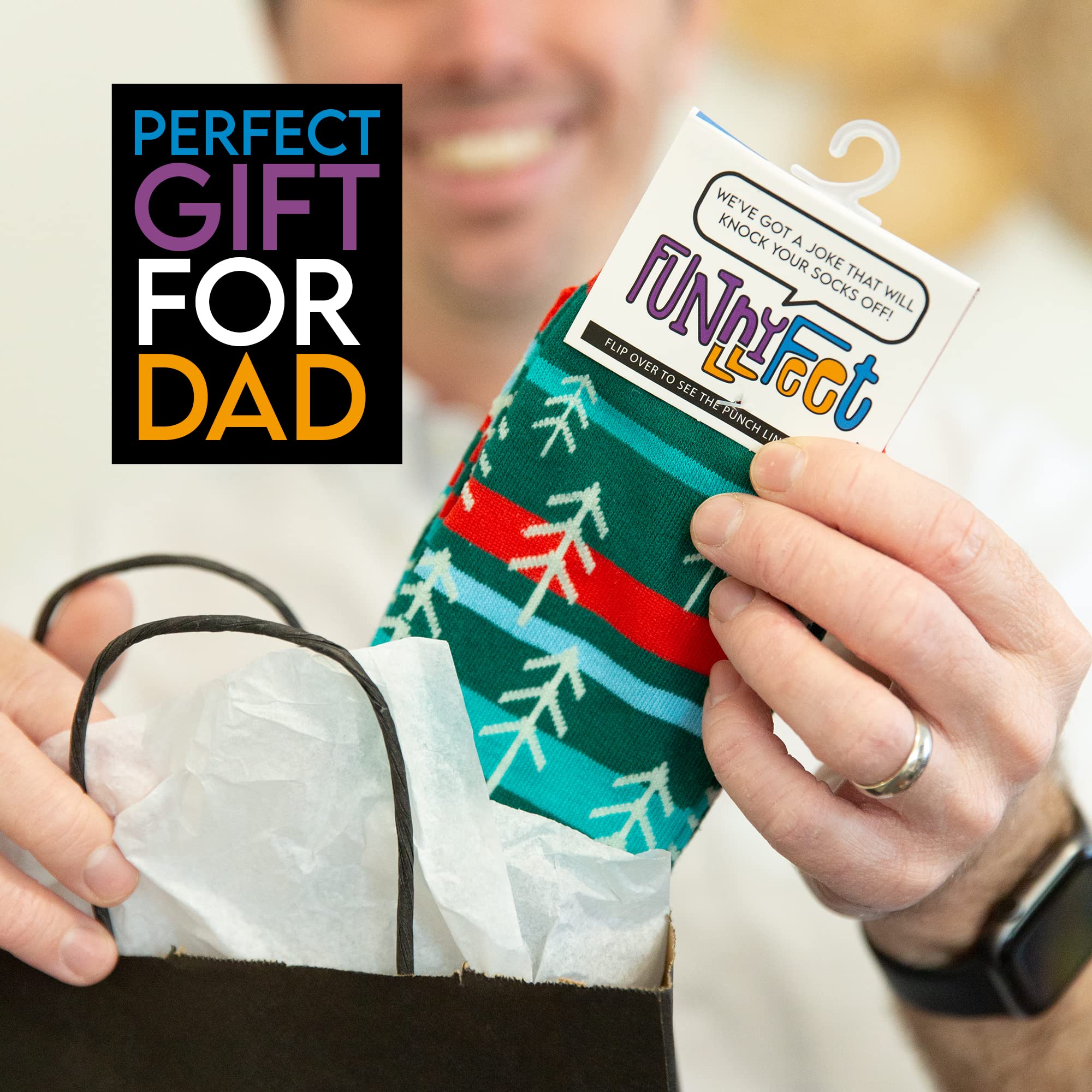 Funny Christmas Socks for Dads by FunnyFeet – “I have a Tree-mendous Dad Joke, It Will Really Spruce Up Your Day" | Striped Christmas Pattern